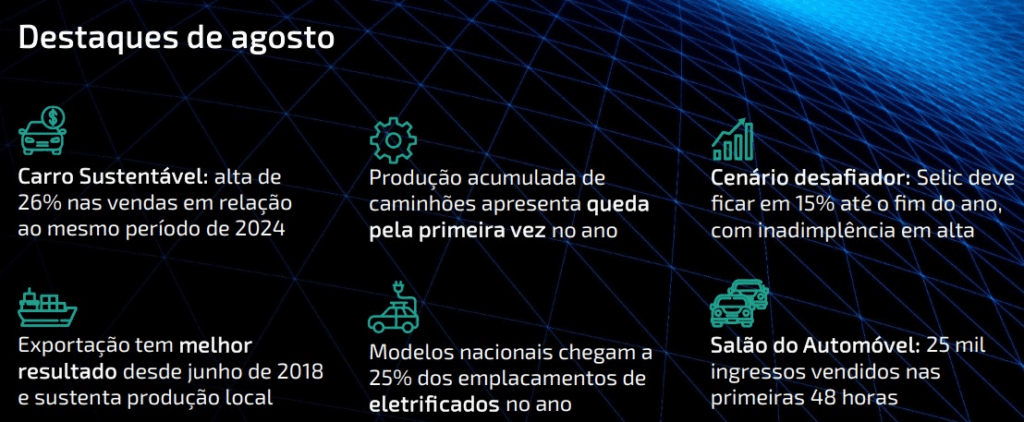 A melhor notícia para a indústria no mês de agosto foi a exportação de 57,1 mil unidades, melhor resultado desde junho de 2018. Esse volume representou uma alta de 19,3% sobre julho e de 49,3% sobre o mesmo mês do ano passado, e teve como grande responsável a Argentina, que já responde por 59% dos embarques no ano. O acumulado geral de janeiro a agosto soma 313,3 mil unidades, 12,1% acima das exportações nos primeiros oito meses de 2024. “O crescimento da nossa produção nos últimos meses decorre da maior presença de nossas associadas no mercado externo”, afirmou Igor Calvet, presidente da Associação Nacional dos Fabricantes de Veículos Automotores (Anfavea). Em agosto as fábricas brasileiras produziram 247 mil autoveículos, sem grandes variações em relações ao mês anterior (+3%) e a agosto do ano passado (-4,8%). No ano, são 1,743 milhão de unidades produzidas, alta de 6% sobre 2024. O mercado interno mantém comportamento de estabilidade, mas com elevação da venda de importados e dos canais de vendas diretas, em detrimento do varejo de modelos nacionais. Em agosto, o total de emplacamentos foi de 225,4 mil autoveículos. “A média diária de vendas foi de 10,7 mil unidades, o segundo mês no ano com média inferior ao mesmo mês de 2024, o que acende um alerta para o último quadrimestre do ano, que precisa subir bastante para acompanhar o ritmo acelerado do ano passado”, pontuou Calvet. O acumulado de emplacamentos deste ano é de 1,668 milhão de autoveículos, apenas 2,8% a mais do que nos primeiros oito meses de 2024. Contudo, chama a atenção a alta de 12,1% das vendas de importados. Em agosto, a China foi o principal porto de origem dos importados emplacados pela primeira vez na história, superando a Argentina, que ocupa esse posto desde o início dos anos 1990. As vendas de modelos nacionais no varejo já caíram 9,3% no ano, ante um crescimento de 17,3% dos importados. Mesmo nas vendas diretas, os nacionais cresceram 12,4%, um pouco abaixo dos 13,8% de alta dos estrangeiros. E a situação seria ainda mais complexa não fosse o bom desempenho dos carros nacionais de entrada nos últimos dois meses, por conta do Carro Sustentável, que elevou em 26% as vendas dos modelos habilitados no programa federal. Outro ponto positivo é o crescimento dos emplacamentos de modelos eletrificados nacionais: eles representaram 25% das vendas totais de híbridos e elétricos no ano. Entre todos os segmentos de autoveículos, o que mais sofre os efeitos dos juros elevados, da alta inadimplência e da desaceleração da atividade econômica é o de caminhões. Em agosto, pela primeira vez houve queda na produção acumulada em relação a 2024. O recuo é de apenas 1%, mas indica uma inversão da curva de crescimento que se mantinha ao longo dos primeiros sete meses do ano. O mercado interno de caminhões já vinha em retração desde abril. “No caso dos caminhões, nem a alta das exportações está sendo suficiente para sustentar os níveis de produção, o que já começa a se refletir em perdas de postos de trabalho nas fábricas de pesados”, concluiu o presidente da Anfavea.
